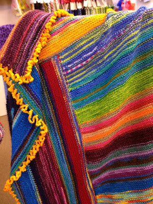 I spent the day knitting there on Friday. Good company and good knitters. I had not brought a project but admired a blanket on the table. Very quickly, I was knitting thanks to the wonderful staff. Because this blanket is knit out of leftover sock yarn, I could buy a bag of colors called "Sock Bites" from Pagewood Farms. Perfect.